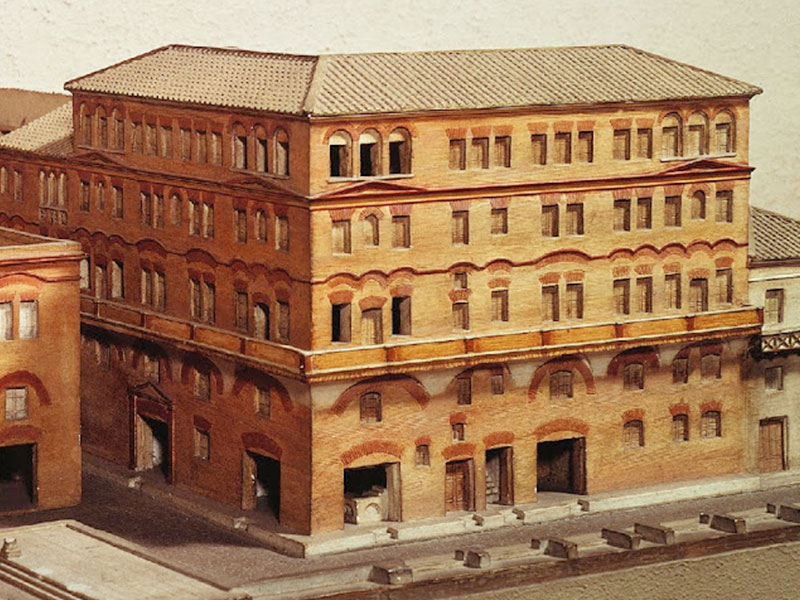 Insulae were buildings that stood several storeys high in the urban blocks between streets. They were arranged around a central courtyard and were used as both dwellings and for business activities. The ground floor was normally occupied by tabernae (shops and artisans’ workshops), while the upper floors featured small apartments that were rented out to society’s poorer classes. These small dwellings, which tended to lack even the most basic of amenities, like running water, heating or a bath, were reached up narrow staircases from the street or inner courtyard. The latter provided natural light and ventilation for the different apartments.