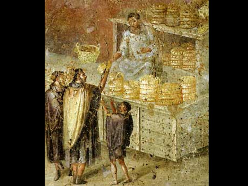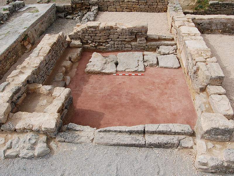 As for the tabernae on the ground floor whose doors were under the colonnades, they tended to be divided into two different parts: the shop itself and a storeroom for keeping goods. Some advertised their products with engravings or paintings on the façade, and part of the space under the colonnade was used to exhibit their wares on counters. Many of these shops also had an entrance with a big threshold. This was grooved so that wooden boards could be slotted into it to form a door. This type of door has also been documented in Pollentia.